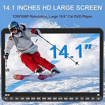 - 14.1”HD Large Screen & Standing Bracket: There dvd player for car portable headrest video players adopts 14.1 inch with 1280*800P HD large screen, which can present crystal clear image and realistic visual while watching movies or videos. And the back with stainless steel headrest bracket that without installation and can be easily hung on a car headrest.