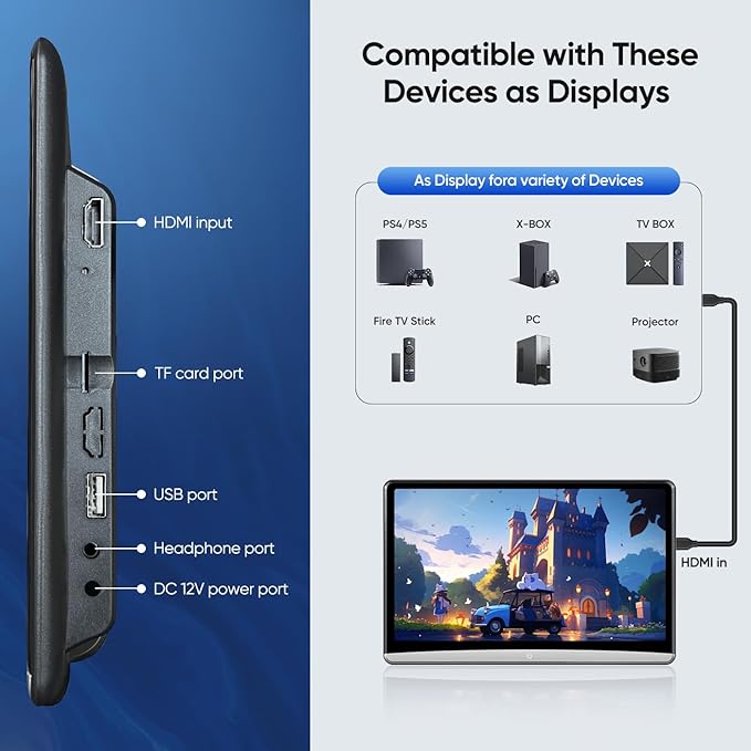 - Multiple Ports Compatible and Built-in Speakers: This adjustable car tv has both HDMI input ports,you can use HDMI cables to connect 2 screens.And they can play the same movie at the same time. The HDMI input function can be connected to Computer, tv box ,Xbox , PS4 ,PS5 and other devices as display.This portable back seat TV has built-in speakers, you can also use FM transmitter to transmit audio to car speakers. In addition to this, Bluetooth headsets or wired headsets can also be used