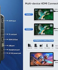 - Sync Screen ,Built-in Double Speakers: This car table tv has HDMI input and HDMI output ports,2 screens play the same movie at the same time when you connect them by HDMI cables . This car video player also works with Computer, tv box ,Xbox , PS4 ,PS5 and other devices as display.This back seat TV has built-in speakers, you can also use FM transmitter to transmit audio to car speakers. You can use Bluetooth headsets or wired headsets