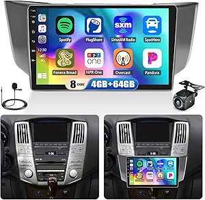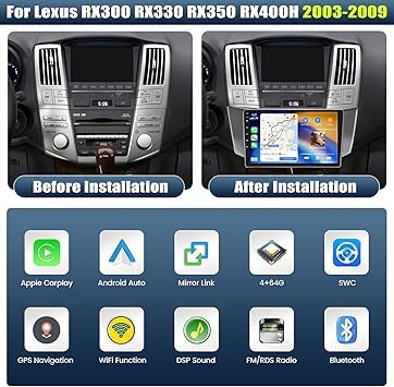 - 【Android 13 Car Stereo Lexus RX300 RX330 RX350 RX400H】: The apple carplay car stereo fits Lexus RX300 RX330 RX350 RX400H 2003 2004 2005 2006 2007 2008 2009. Android 13 system, 9” Capacitive touch screen, screen size is 228mm*218mm*131mm,8 core CPU,4G RAM+64G ROM, running smoothly in colleges and universities.A variety of EQ sound effects scene selection.Capacitive touch screen,1024*600 high resolution, Support 1080p video, will provide you the Excellent experience in the car.