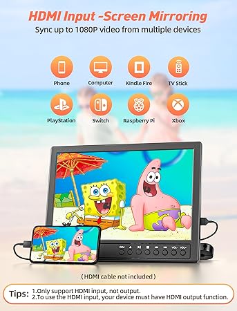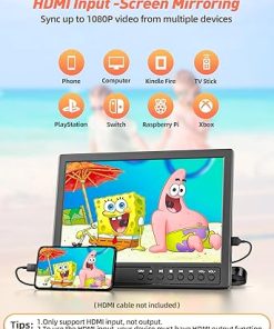 - 【HDMI Input and AV, RCA Sync Function】The car DVD player has built-in HDMI input port, use HDMI cable to sync 1080P video from your mobile phone, computers, Raspberry Pi, Xbox or kindle fire, etc. (Please make sure your phone supports HDMI output function before ordering). It can also sync the same movies to another portable car DVD player via AV cable and even to TV via the included RCA cable for lossless transfer of images.