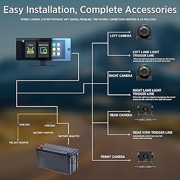 - 【Auto Power on with Your Vehicle Ignition & Easy to Install】- Power supplied by your car directly. Default boot recording, no missing seconds. Advanced safety design without risk of battery explosion and with much longer life; Smart segmented storage, seamless loop recording, never full disk. Wired camera system without any signal problem. One power cord supports the whole system. The camera only needs to connect the extension cable from the monitor.