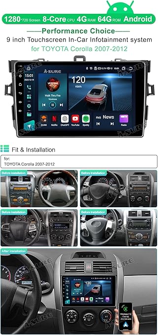 The ASURE 9-inch Car Stereo upgrade for my Toyota Corolla has completely transformed my driving experience. The 1280×800 touchscreen is responsive and the display is crystal clear. Connecting my phone through Wireless CarPlay is seamless, and the built-in GPS navigation works flawlessly. I’m impressed by the 8-core processor and 4+64GB memory, which keeps everything running smoothly. The sound quality with DSP is fantastic, and controlling everything with the steering wheel buttons is super convenient. Installation was straightforward, and it fits perfectly in my dashboard.