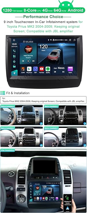 Dash Camera-ASURE-ASURE 9 inch Car Stereo Radio Upgrade for Toyota Prius 2004-2009-8Core 4G+64G Android System Car GPS Navigation Unit with 1280×720 HD Touchscreen