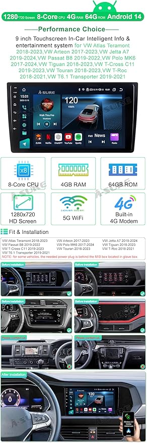 - 9 inch Car Stereo Radio for VW Atlas Teramont2018-2023,VW Arteon 2017-2023,VW Jetta A72019-2024,VW Passat B8 2019-2022,VW Polo MK62017-2024,VW Tiguan 2018-2023,W T-Cross C112019-2023,VW Touran 2018-2023,VW T-ROC2018-2021,VW T6.1 Transporter 2019-2021,please take care of the second picture!!