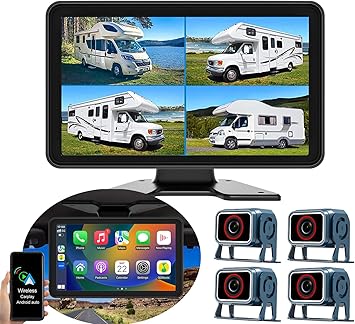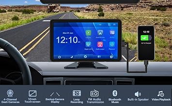 Dash Camera-Connorddo-10.1” Touch Screen 4CH 1080P Car Dash Cam DVR Backup Camera System FM Radio Built-in Speaker Wireless Apple CarPlay Android Auto Link Audio Output Playback for Truck Caravan Trailer Motorhome RV