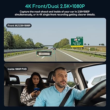 - 4K Dash Cam: When recording in front-only mode, the dashcam’s front camera captures stunning 4K clear video at 3840x2160P@30fps, ensuring that crucial details such as road signs and car plates remain highly legible at all times