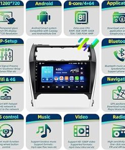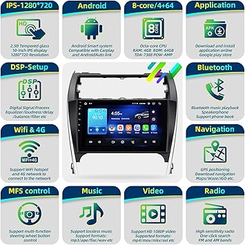 - Rich functionality:This CAMRY radio has wireless Carplay, Android auto, GPS navigation, FM / AM radio, Bluetooth, Bluetooth music, USB, multi format music player, 1080p video player, 5G WiFi, 4G LTE(Support for most carriers in the US),APP download, backup camera, SUB and audio output, AUX audio and video input, external microphone,SWC steering wheel control.