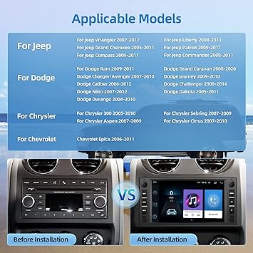 - 【Applicable Car Models】Android double din car stereo for Jeep Commander (2008-2011); Jeep Compass (2009-2011); Jeep Patriot (2009-2011); Jeep Grand Cherokee (2005-2011); Jeep Liberty (2008-2011); Jeep Wrangler/unlimited (2007-2015); CHEVROLET Epica (2006-2011); CHRYSLER Sebring (2007-2010); Aspen (2007-2010); Wrangler/unlimited (2007-2015); DODGE Caliber (2009-2011); Ram Pickup Series (2009-2011), etc.. Car Head Unit with Android 10 version, 1GB RAM + 16GB ROM.