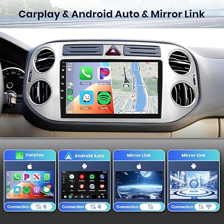 - Wireless Carplay & Android Auto & Mirror Link: Android car stereo for Volkswagen Tiguan with wireless carplay & Android Auto. Bluetooth connection for wireless function,such as using voice control, real-time navigation, live video,and so on. Also supports wireless mirroring for smartphones, which can be used to make calls, send and receive text messages, play music and more.