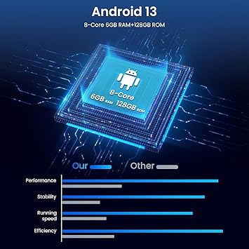 - Advanced Android System: Double Din Car Stereo running on Android 13 with an 8-core processor, 6GB RAM, and 128GB storage, This advanced hardware setup allows for quick access to multimedia, navigation, and communication tools, all while providing the reliability needed for a safe and enjoyable driving experience. The robust storage space also means that users can store a vast library of music, podcasts, and other media directly on the system, eliminating the need for external storage devices