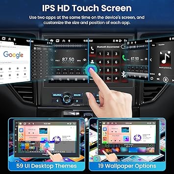 - Enhanced User Interface and Personalization: The double Din carplay radio dive into a world of customization with 59 UI Desktop Themes and 19 Wallpaper Options, letting you personalize your car’s audio system to match your style. Plus, with a 7-inch touchscreen display, your options are vivid and easy to navigate. and a split screen function for multitasking