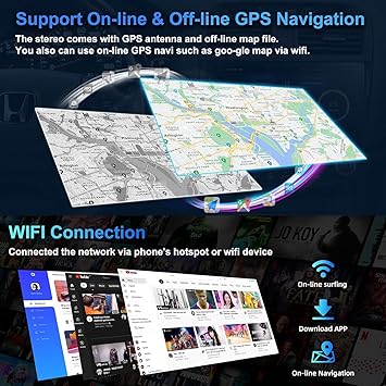 - 【Support Off-line and On-line GPS & WiFi】Off-line and On-line GPS Navigation Software! Includes voice and visual turn-by-directions 11 million+ POI library, 2D & 3D routes plus building views major cities, Green Routing, fuel tracker. Support WiFi connection. You can connect your WiFi internet device or mobile phone hotspot to connect to the network. And download apps or movies, or watch YouTube videos, it’s like a tablet.