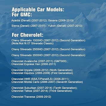 - 【Applicable Car Models】For Chevy Silverado 1500 (2007-2013);For Chevy Silverado 2500HD (2007-2013); For Chevy Silverado 3500HD (2007-2013); For Chevrolet Avalanche (2007-2011); For Chevrolet Express Van (2008-2011); For Chevrolet Impala(2006-2012); For GMC Acadia (2007-2012); For GMC Savana (2008-2013);For GMC Sierra (2007-2011); For GMC Yukon (2007-2013)