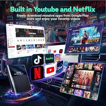 - Magic Box Streaming Device: Built in video Apps like Netflix, YouTube; Allow to download various apps (such as Hulu, tictok, etc) from google play store; Support 1920*1080P HD video; Can be connected to the rear seat monitor; Enjoy your favorite movies, videos,music on front or back seat during the entire trip; A great streaming device to upgrade your car life