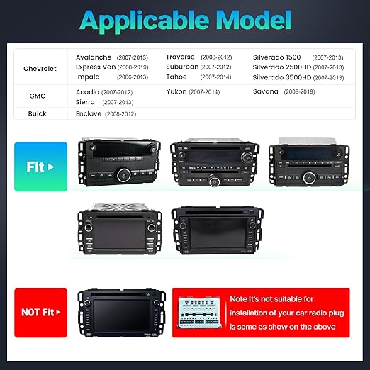 - 【Applicable Models】 Leadfan Android car stereo for Chevrolet Chevy Silverado 1500 2500HD 3500HD 2007-2013, Avalanche 2007-2013, Express Van 2008-2019, Impala 2006-2013, Traverse 2008-2012, Suburban 2007-2012, Tahoe 2007-2014, GMC Acadia 2007-2012, Yukon 2007-2014, Sierra 2007-2013, Savana 2008-2019, Buick Enclave 2008-2012. Models and years just for your reference, Please confirm the shape and size of the center console before bidding. (Don’t support SiriusXM Compatible.)