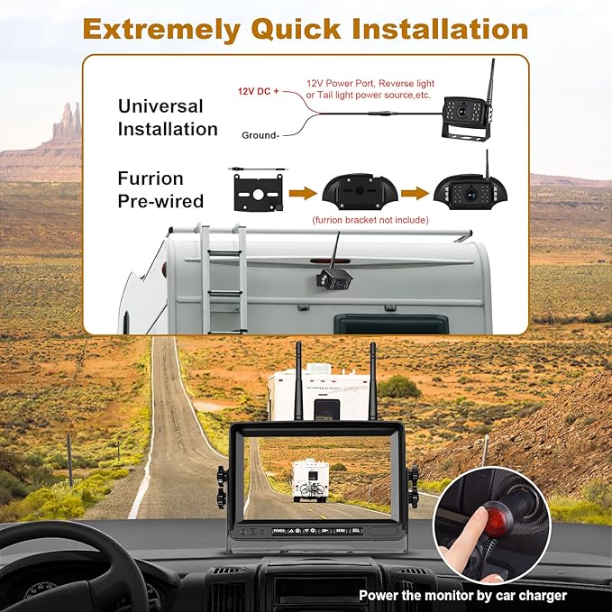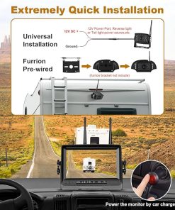 - 【Plug & Play Wireless Backup camera System】:This wireless backup camera for rv can be installed in two ways: either hardwired using a standard 12V DC power supply, or by using the Furrion pre-wired adapter plate, which makes it ready to use right out of the box.
