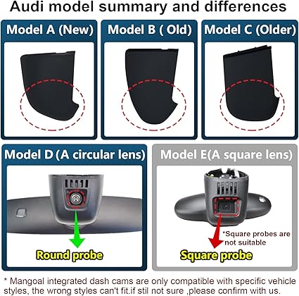 - 【Custom fit for Audi】Mangoal 4K dash cam custom fit for for Audi (Model C Beige) perfectly behind the rear view mirror like original. No messy wiring exposed, no complicated rewire at all. Perfectly intergrated with Audi. Taking power from Fall-rain sensor,EZ to install.Model C appearance colors are black, gray and Beige. Because there are many models and colors, it is best to take a photo of the vehicle sensor cover for us to confirm.