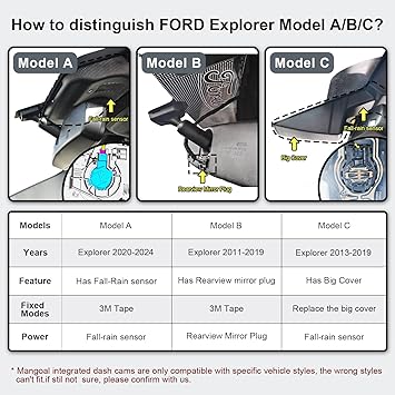 - 【Custom fit for Ford Explorer】Mangoal 4K dash cam can fit perfectly behind the rear view mirror like original. No messy wiring exposed, no complicated rewire at all. Perfectly intergrated with Ford Explorer U625 2020-2024 vehicle styles. Such as Base, XLT, ST_Line, ST, limited, Timberline, Platinum and King Ranch. COMPATIBLE WITH ALL VEHICLE STYLES EQUIPPED WITH RAIN FALL SENSOR!