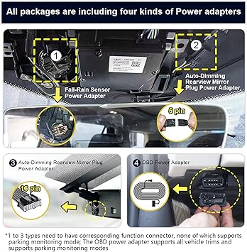 - 【Please Note】We have prepared 4 cables in total, Auto-Dimming PlugAdapter Cable 16 pin x1, Auto-Dimming PlugAdapter Cable 5 pin x1, Rain Fall Sensor Adapter x1. If you don’t have these 3 interfaces, we also have spare OBD Cable. Please check the 3rd picture carefully.