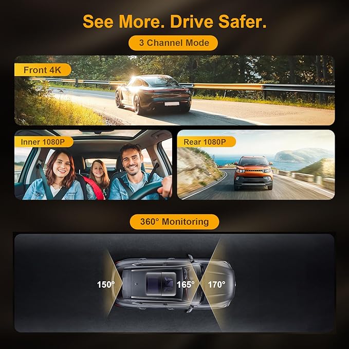 - [ 3-CHANNEL SIMULTANEOUS RECORDING ] – The K80 mirror dash camera supports simultaneous recording with a front camera at 2160P/170°, a rear camera at 1080P/150°, and an in-cabin camera at 1080P/165°, providing comprehensive protection for your vehicle, assisting you in preserving and presenting evidence in case of accidents or collisions.