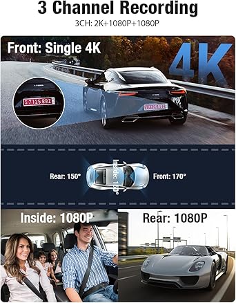 - 【2K 3 Channel Dash Cam】OMBAR 3 channel dash cam monitor the front, rear and inside of your car simultaneously in 2K+1080P+1080P resolution. Never miss a moment with a 170° front, 150° rear, and 150° cabin view. Surveillance coverage of 360° full protection, providing valuable evidence for insurance claims or disputes