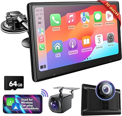Dash Camera-Perloyal-10 Inch Touch Screen for Car – Used for Wireless Apple Carplay Android Auto – Portable Car Stereo with 2K Front Dashcam- 1080P Rear Dash cam Backup Camera