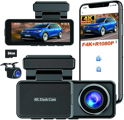 - WiFi connection function:This 4K dual dash cam offers built-in WiFi for simple mobile device connection via app. Seamlessly view & share real-time/recorded vids on social media. Clear instructions make setup easy. Enjoy HD front & rear recording for total car protection. App download required for connection. All settings adjustable via app. 2.4G WiFi module allows smartphone connection for live view, playback, & settings