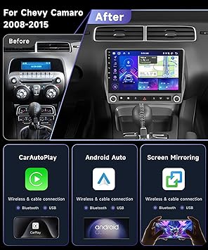 - 3.【Wired/Wireless CarPlay / Android Auto】 This 2009 Camaro radio support wired/wireless Apple CarPlay and Android Auto, you could more easily access the apps of your phone. You can also able to wake up the voice assistant Siri or Goo-gle Assistant to operate Apps on this 2007 Camaro head unit , easily use GPS navigation, calls, message, music, and much more functions while keeping your hands-free for safe driving.