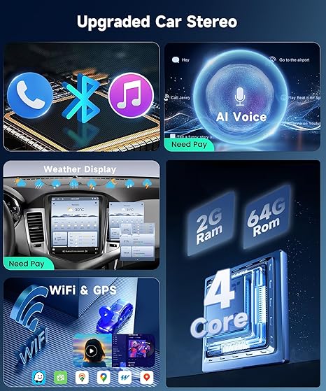 - 2.【Android Car Stereo & WiFi GPS & AI Voice】 Carrying upgraded Android system,4-core CPU,2G RAM & 64G ROM,proving you smoother experience and faster response with 9.7 inch 1080P Touchscreen.Connected with WiFi,You could download various Apps such as Waze,Spotify,Google Maps etc. as well as update offline maps.AI Voice control:Podofo assistance enables you drive more attentively.Podofo stay with you all the way