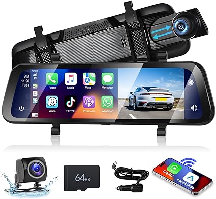 Dash Camera-podofo-Podofo 9.66″ Apple Carplay Mirror Dash Cam with Android Auto- Rear View Mirror Camera Front and Rear Dual Cameras Support Voice Control Night Vision Parking Assistance Monitoring 64G TF Card
