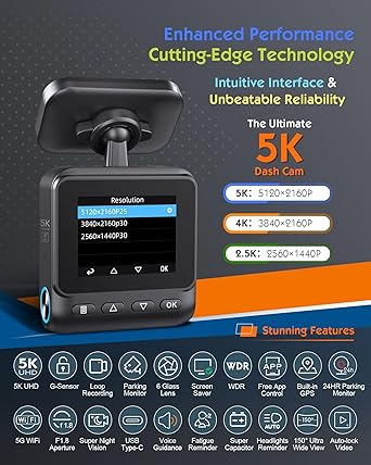 - EQUIPPED WITH CUTTING-EDGE TECHNOLOGY FOR 2025: Think that’s all? Not even close! It also has other features such as motion detection, collision detection, time-lapse shooting, G-sensor, emergency video lock, light reminder, fatigue driving reminder, optional 5K/4K/2.5K resolution, EV/WDR settings, screen saver, built-in super capacitor for extending product life, support for microSD cards up to 512GB, compact appearance, user-friendly buttons, exclusive multi-functional free APP use and more.