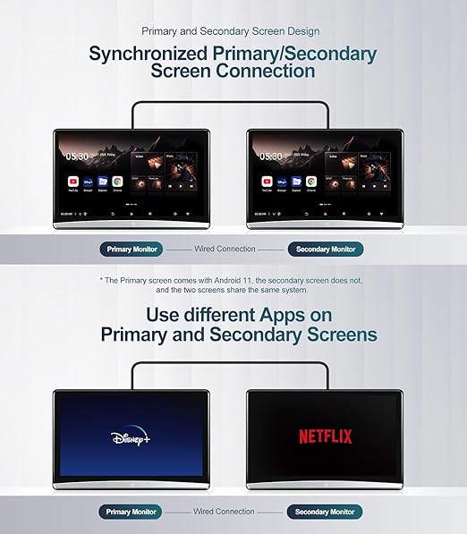 - Android Car TV: This headrest monitor Car TV, adopts Android 11.0 system, supports WiFi 5G/2.4 GHz, and can be connected to the personal hotspot of the mobile phone. You can download and install APPs APKPure, such as Prime video, and other video APPs.This car tv is great for car travel and your kids and family will love it.