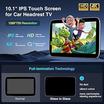 - 【10.1” HD IPS Touch Screen】The car headrest TV adopts 10.1-inch IPS screen with 1280*720 resolution and supports 4K 3840’2160@60fps /H.265 video decoding. The screen is fully laminated, with no dust or air between the touch panel and the screen. It will bring you a clear and smooth video experience and more happiness for your journey!