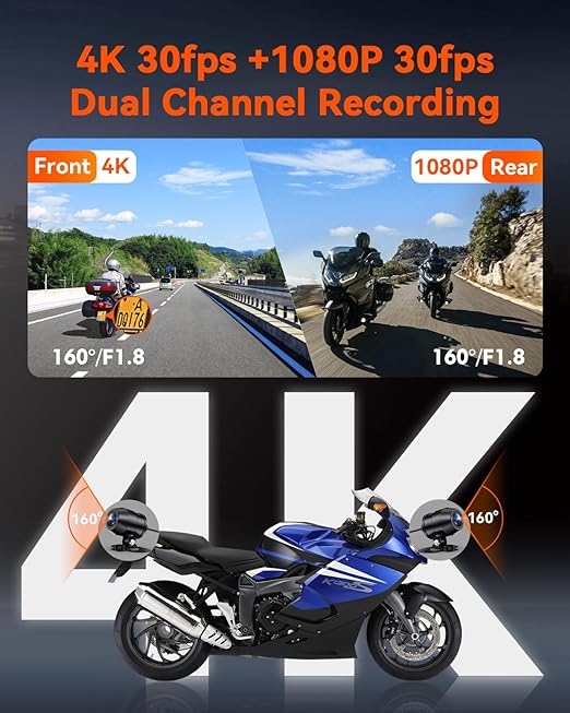 - [ 4K + 1080P Dual Recording & 160° Wide Viewing Angle ] With the technology of STARVIS, F1 motorcycle front and rear cameras simultaneously record up to 4K + 1080P 30fps resolution, capturing every wonderful moment on the road very clearly. The 160° front camera and 160° rear camera greatly reduce blind spots and provide more than 3 lanes of traffic to capture more detail.