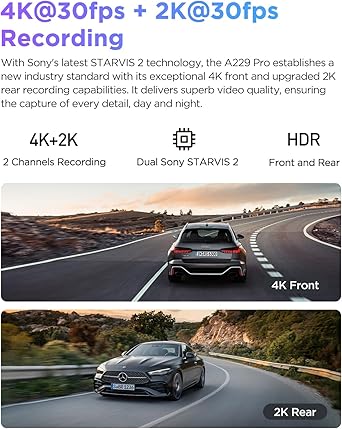 - 【4K +2K Dual STARVIS 2 Sensors Dash Cam】 The pioneering A229 Pro dash cam is equipped with dual flagship SONY STARVIS 2 image sensors – IMX678 and IMX675. Simultaneously supporting 4K 2160P resolution for the front camera and 2K 1440P for the rear camera. It delivers smooth cinematic 4K and 2K image quality and ensures effortless license plate reading and detail capturing, day or night. Providing you all-around security monitor.