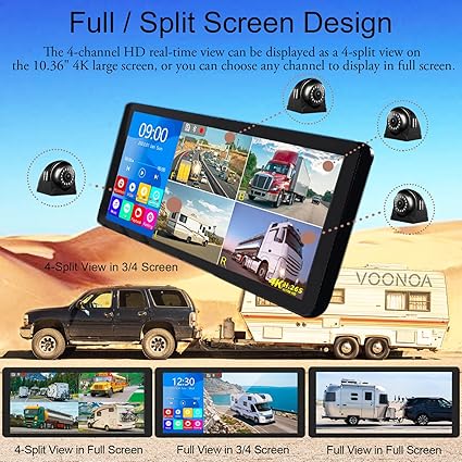 - 4K Screen & 4 1080P Backup Camera: With the 10.36 inch 4K ultra HD 4-split touch screen & 4 pcs of 1080P Full HD camera, you can get sharper, cleaner and more vivid view on road to get the ultimate travel pleasure