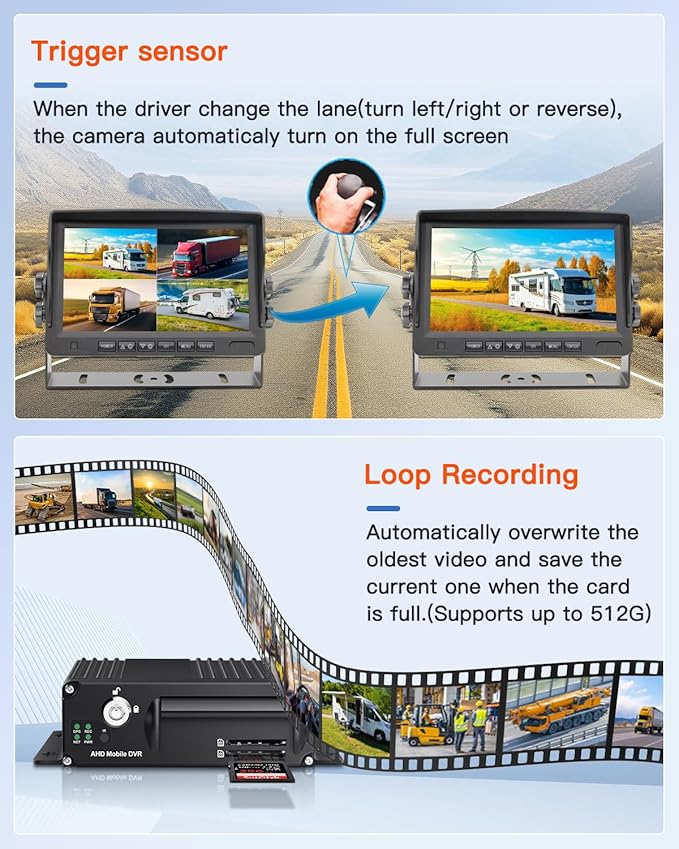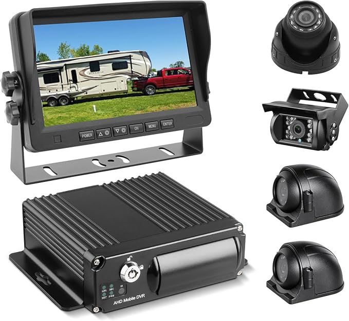 - 【7-inch HD VGA Monitor – 360° Monitoring and Easy Installation Camera System Effectively eliminates blind spots on your vehicle 】① Includes 8-foot monitor power supply cables, offering multiple installation options ② Can be powered directly from the MDVR, simplifying the installation process ③ Screen resolution: 1024×600