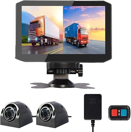 - 【7” IPS Monitor】: The 7” IPS monitor allows you to enjoy a large screen view. And you can switch between full screen mode and split screen mode using the wireless remote. Equiped with a sunshade, it can help the driver better view the display. Long enough hard wired connection with camera (6.5ft/49.2ft)will provide you stable and high quality video transmission. If the cable is not long enough, please contact us in time