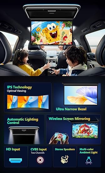- 🚙 BUILT-IN STEREO SPEAKERS / BLUETOOTH AUDIO TRANSMISSION – No external speakers or headphones required, the monitor will fill your vehicle with pleasant stereo sound whether you are playing music or movies on it, direct and convenient. Or you have more suitable options on how to output sound from the roof player with one Bluetooth headphone (search ASIN: B07V7TNS28) or IR headphones (search ASIN: B01M1RQBOS, B01LWXVAA7).