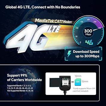 - INTEGRATED 4G SOLUTION – Access your data anywhere, anytime! Just insert a Micro-SIM network card and enjoy the convenience of 4G mobile broadband connection anywhere the way it should be, or even SOJO in your car. Besides, it supports 99% of carriers worldwide. Supported Bands: 1, 2, 3, 4, 5, 7, 8, 12, 17, 20, 28, 38, 40, 41, 42. Not supported Bands: 13, 25, 26.