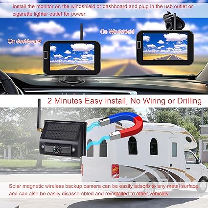 - 【2-Minute Quick Install】The solar wireless backup camera boasts 10 powerful neodymium magnets that firmly attach to the vehicle’s metal surface.This design not only ensures a secure fit but also allows for simple removal and reinstallation on different vehicles or in various locations. The monitor can be quickly powered via a cigarette lighter or USB cable, streamlining the installation process to just 2 minutes. This feature not only saves time but also reduces costs.